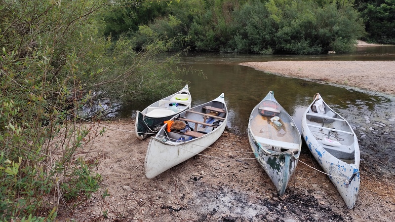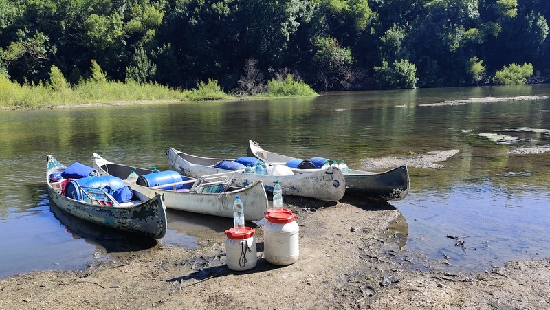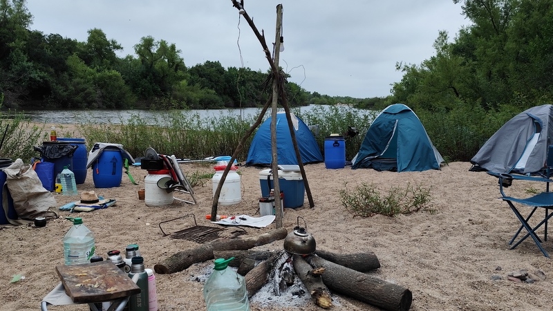 Mientras con las canoas en la orilla, íbamos a armar las cargas, ¡detectamos un problema!, ¡las tarrinas de Facultad eran más grandes que las que nosotros usamos en el ACAL, que entran óptimamente en las canoas, estás entraba una y la segunda no! Comenzamos a rearmar tarrinas para llevar solo una de las grandes y el resto ver como entraban en las que habíamos llevado nosotros, lo que hizo que, durante toda la travesía, tuviéramos tarrinas comunitarias con cosas personales, muy mezcladas.