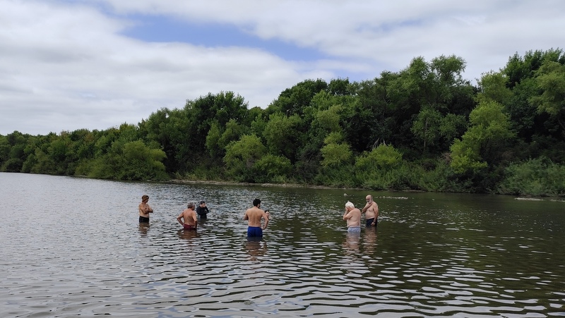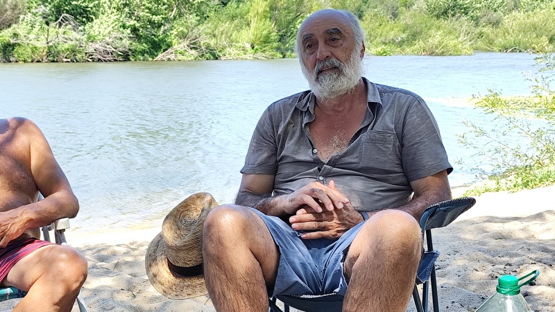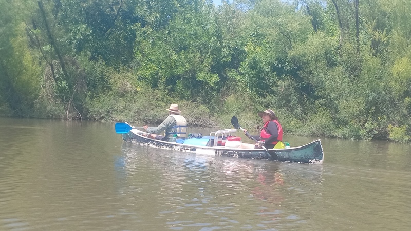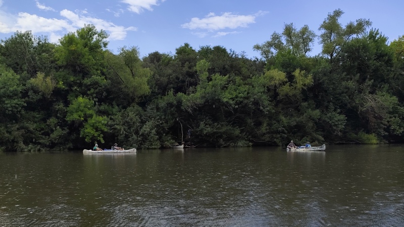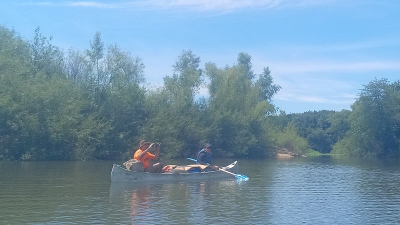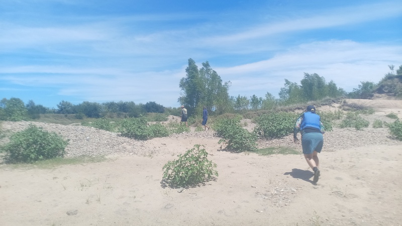 Comenzamos las paradas en cada arenera que encontrábamos en el río y en alguno de los casos la desazón de los académicos, porque el río no tenía que ir por donde iba, según su percepciones desde las imágenes satelitales, lo que en realidad pasaba es que la extracción de arena había cortado el cauce para que pasaran los camiones y el río se había abierto camino por un brazo secundario. En esas paradas los tres timoneles Acalenses nos quedábamos en la orilla, con las sillas, la bandera, buscando una sombra y dándonos algún que otro chapuzón, lo que hacía totalmente llevadera la ola de calor anunciada.
