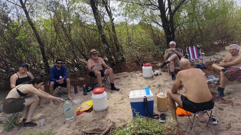 Después del almuerzo seguimos remando y bañándonos hasta llegar al destino, nos estaba esperando Inés con la camioneta y bebidas frías, en el río no teníamos conciencia del calor que hacía en el mundo terrestre, los proeles académicos llegaron sanos y salvos, sin ningún naufragio y habían tenido un excelente desempeño, los timoneles muy contentos de la travesía, fueron algo así como 26 km en tres días, o sea lo que normalmente hacemos en un día de travesía.