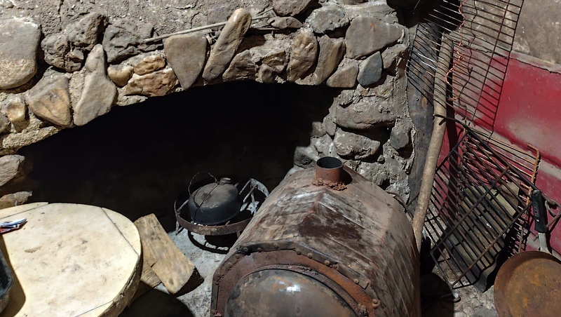 ¡¡Cuando subimos!! Nos encontramos con mesas, bancos, fogón y una casa con tremenda estufa de piedra y horno de hierro, todos los muebles y colchones colgados como en un segundo piso, para cuando vienen las crecientes y un baño con una estufa tipo salamandra tapada con piedras, para resistir cualquier frío bajo cero en los inviernos. Ahí no tuvimos que sacar prácticamente nada de lo comunitario, porque teníamos todas las comodidades y un monte de galería con lugares para las carpas espectaculares. Al Refugio de Claudio se llega solo por río o caminando por el monte, no llega ningún camino y así se lo ha ido armando, con todo para resistir lo que venga.