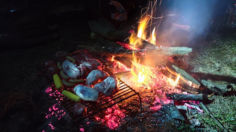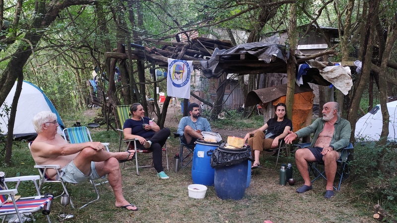Después del café con queso y dulce comenzamos a preparar ya el fogón para las colitas de cuadril, la bondiola, choclos y boniatos que iba a hacer Pucho o sea timoneles completos nosotros. En la charla de fogón entramos a encontrar tíos y tías, resulta que Lucía es sobrina de Carolina del ACAL y que uno de los integrantes de la Asamblea por el Agua del Río Santa Lucía es uno de los sobrinos de Pucho.